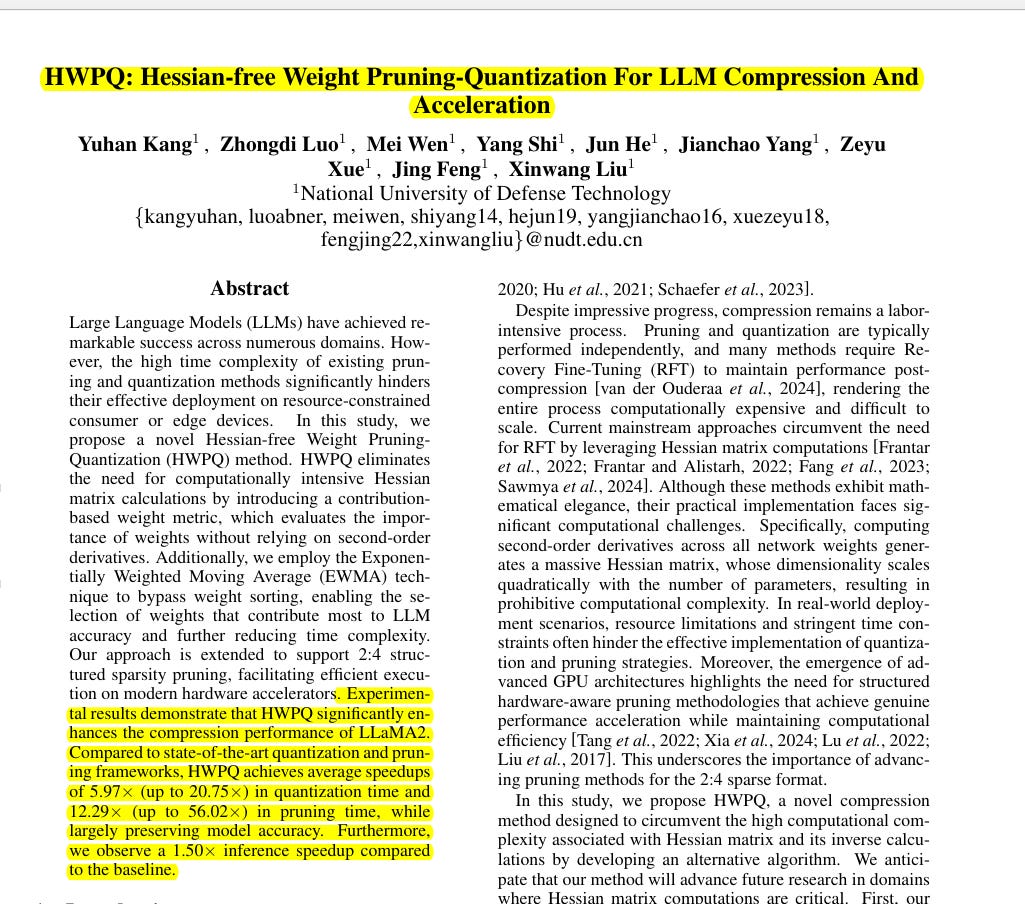 → The paper introduces a Hessian-free Weight Pruning-Quantization (HWPQ) method. This method avoids the computationally expensive Hessian matrix.