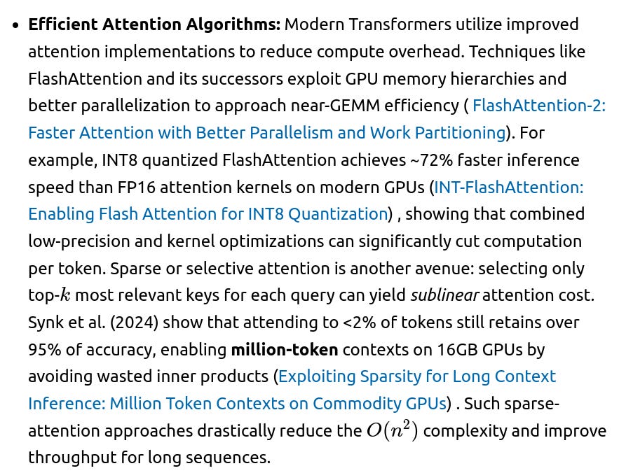 Quantization for Faster Inference: As noted, quantization not only saves memory but also often improves latency due to better cache utilization and specialized hardware instructions. In 2024, Chen et al. introduced INT8 Token-wise Attention integrated with FlashAttention (INT-FlashAttention: Enabling Flash Attention for INT8 Quantization) . Their INT-FlashAttention executes the entire attention module with INT8 inputs/outputs, achieving 72% higher inference throughput than the FP16 version without accuracy loss . This showcases that even the core Transformer operations can be quantized for speed. Beyond attention, fully quantized LLMs (4-bit weights and INT4/INT8 activations) running on GPUs (or even ASICs) are becoming feasible, dramatically accelerating per-token inference. These improvements are particularly beneficial for large vocabularies because the sooner each token is produced, the more overall latency is amortized when generating long sequences.
