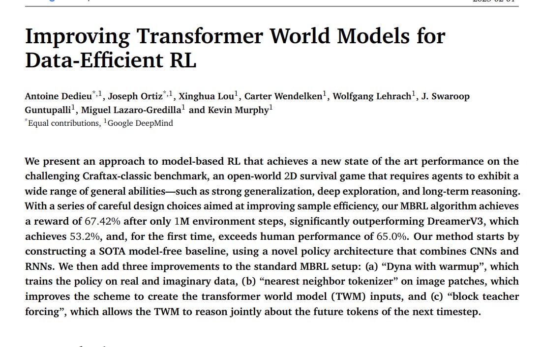→ To enhance this baseline, the paper incorporates model-based reinforcement learning techniques. A core component is "Dyna with warmup". This method trains the policy using both real environment data and data generated by a Transformer World Model. This hybrid approach boosts sample efficiency.