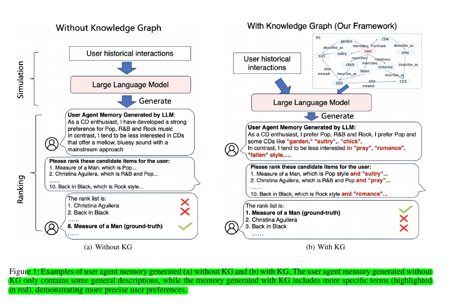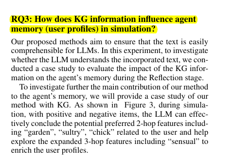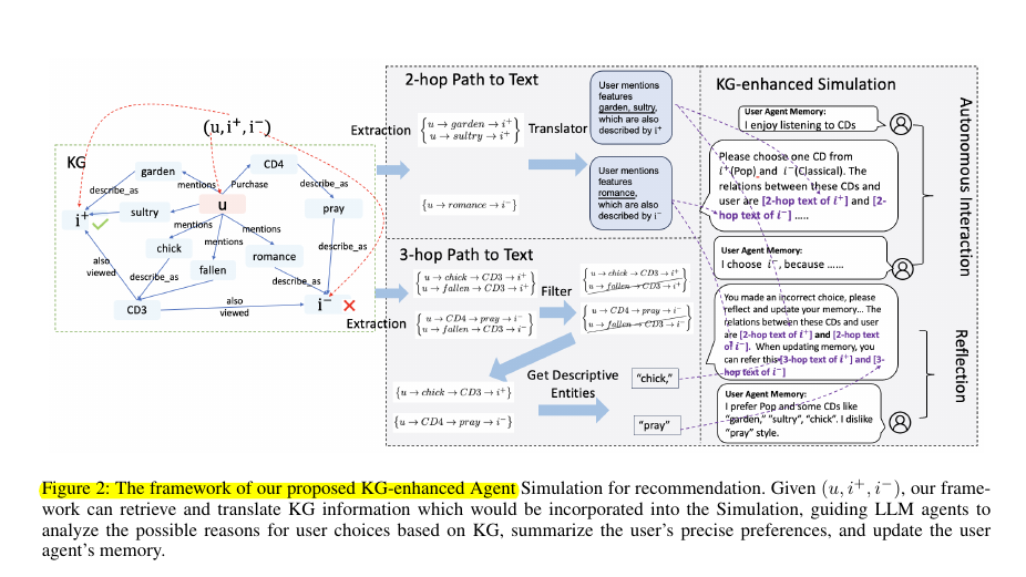 • Framework positions user and item within Knowledge Graph and integrates paths as natural language descriptions into simulation