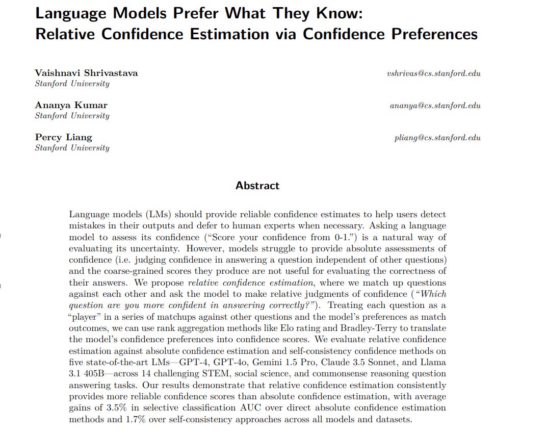 This paper proposes relative confidence estimation. It moves away from direct confidence scoring. Instead, it asks the LLM to compare its confidence between pairs of questions. These pairwise preferences are then aggregated into meaningful confidence scores using rank aggregation methods.