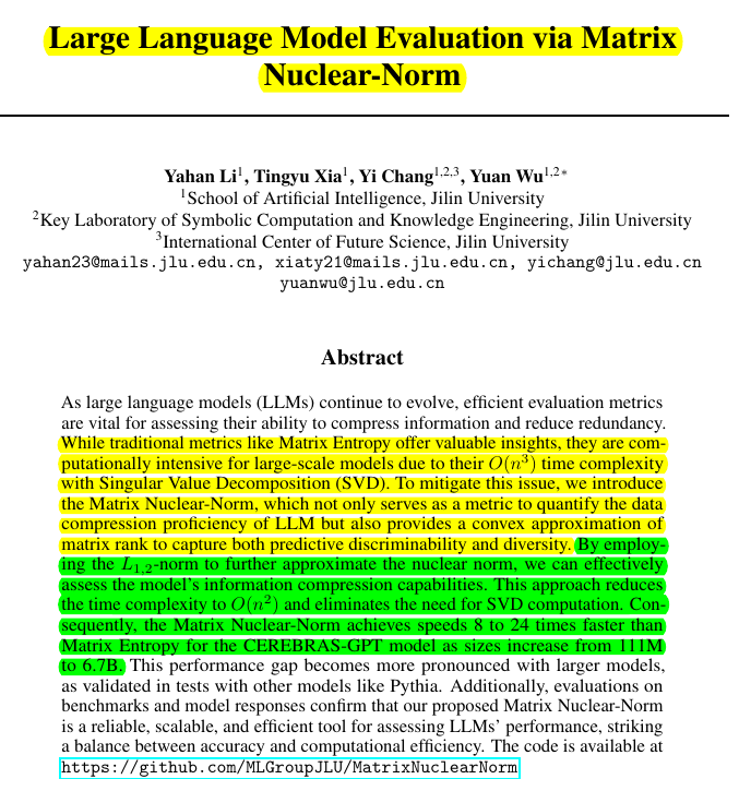 Matrix Nuclear-Norm, proposed in this paper, slashes LLM evaluation time while maintaining accuracy through clever math tricks