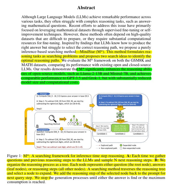 Instead of heavy training, MindStar (M)* proposes a search-based approach at inference. You keep the LLM fixed (e.g., Llama-2), but you systematically prompt for partial steps, score them with a process reward model, and expand or backtrack in a tree-like structure until you find a correct final solution.