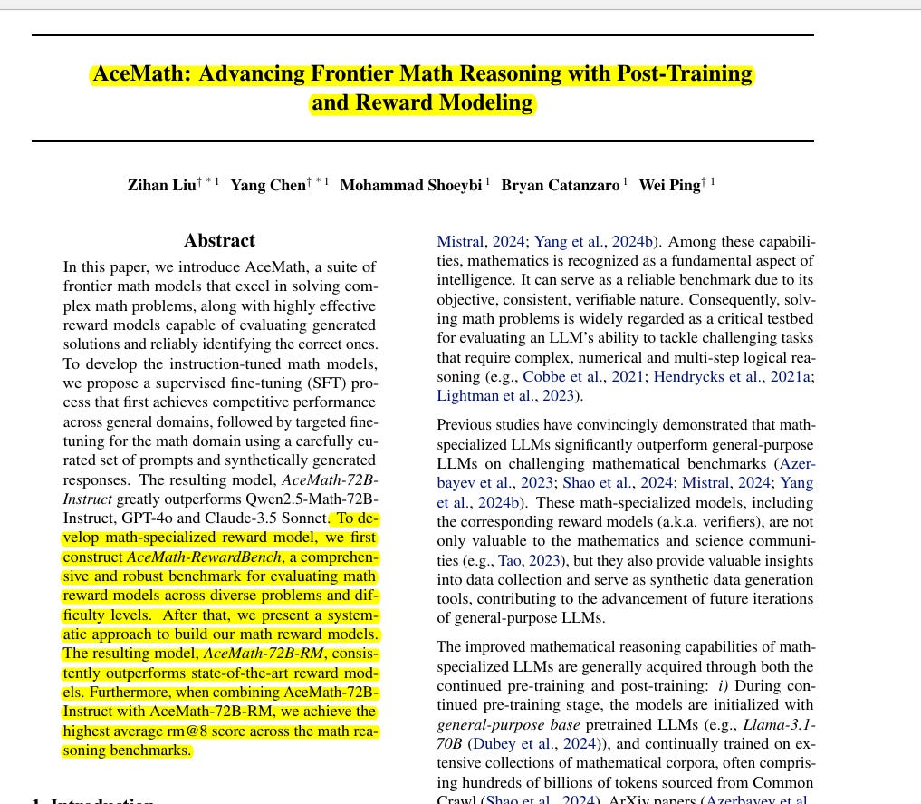 AceMath focuses on building math-specialized models, presenting a new suite of advanced math models (AceMath-7B, 72B, etc.). Notably, the authors rely on both post-training on curated math data and reward modeling to filter out or weight correct solutions.