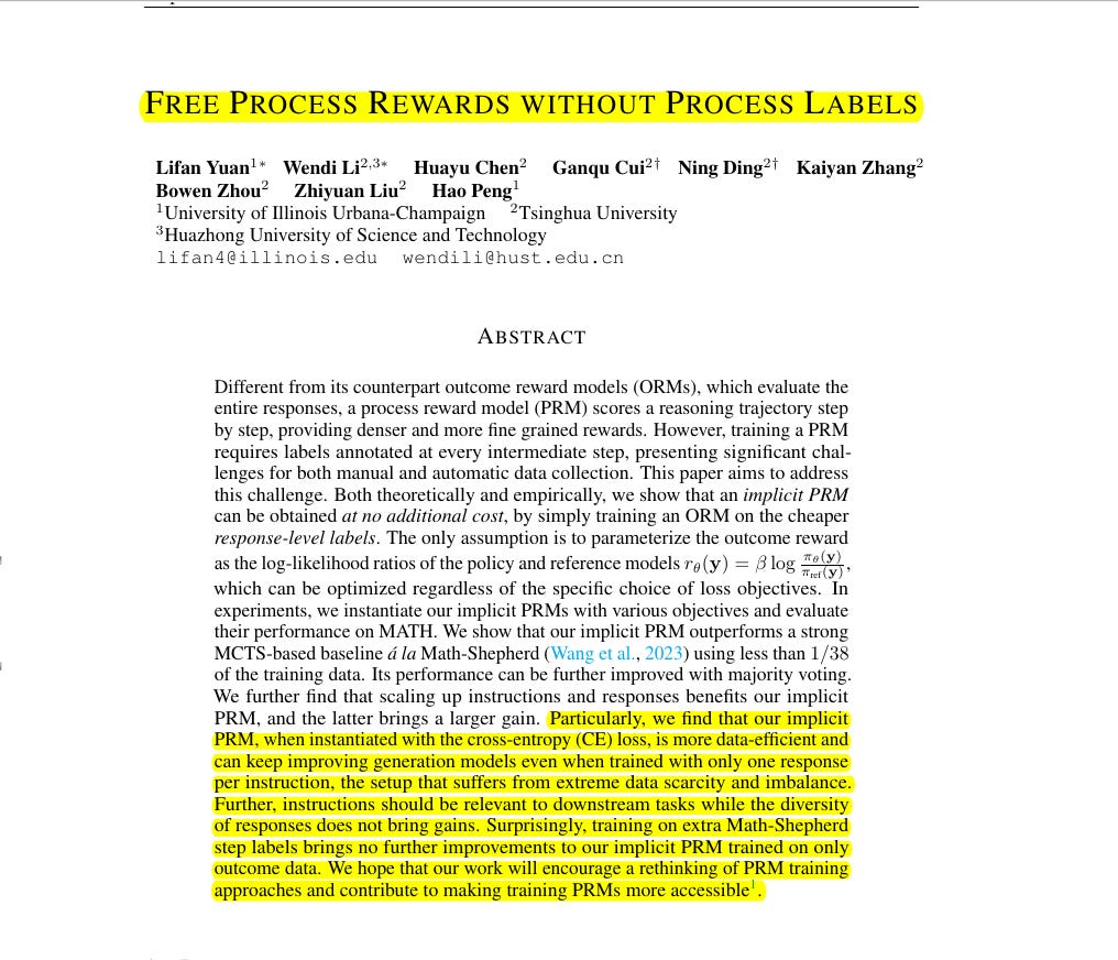 While “step-labeled” data helps, they claim you can skip it entirely if your base LLM is already strong on final outcomes. The overarching pattern is that simple expansions of the final correctness labels, plus parameter re-interpretations, are enough to push step-level scores for free. Again, this underscores the fundamental role of data—here, the data is final correctness answers. The algorithm is basically a “smart usage” hack.
