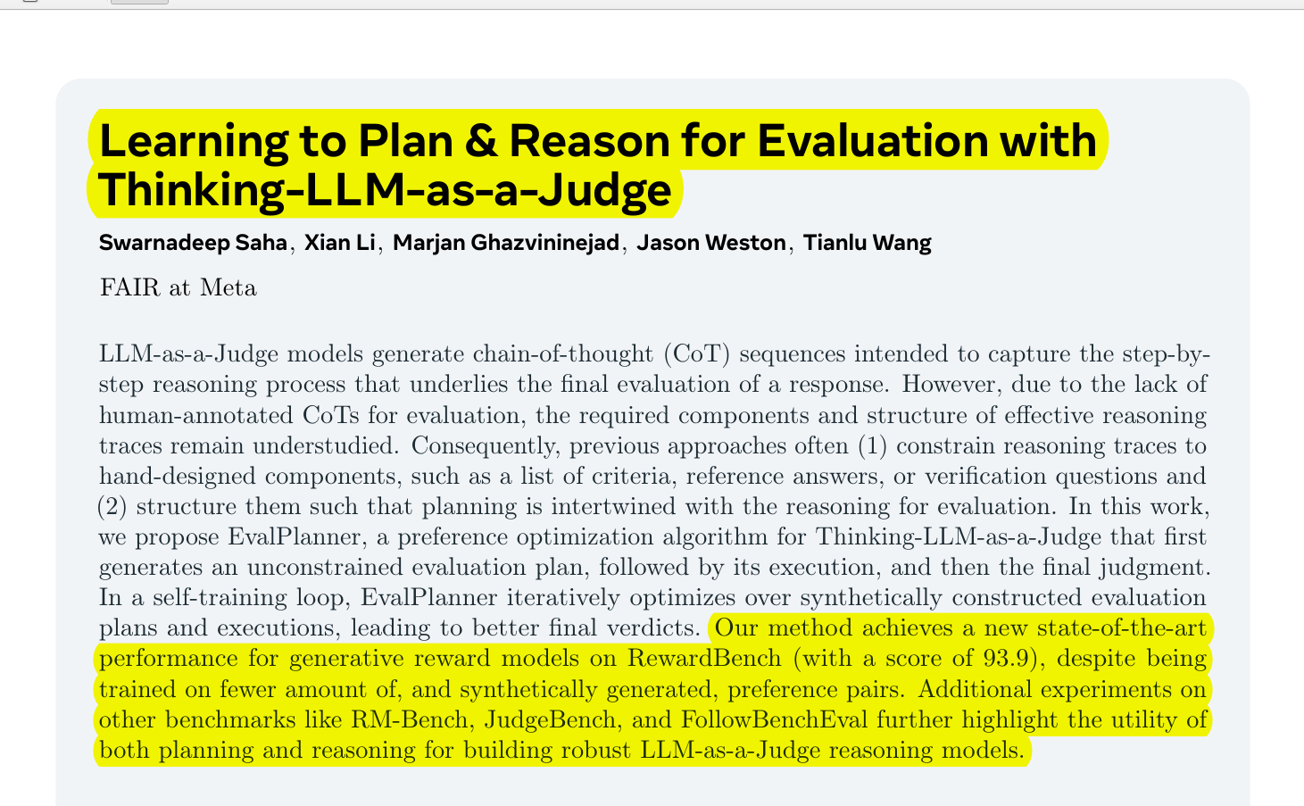 📌 Synthetic data generation for training judges is a significant contribution. EvalPlanner demonstrates effective self-training using preference optimization over plan-execution pairs.