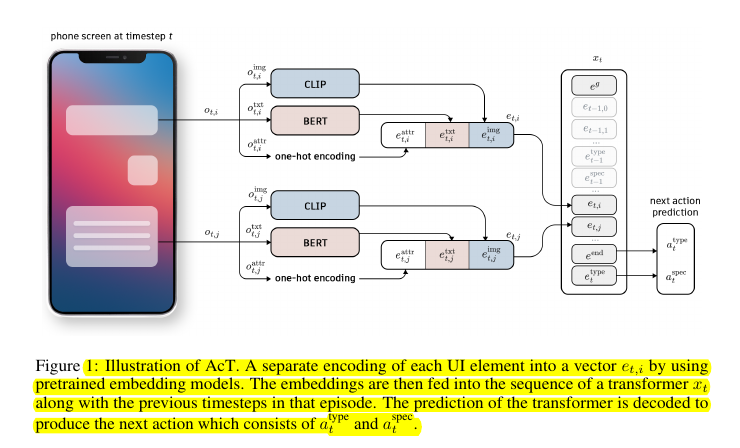 Action Transformer (AcT) for predicting action types and UI element interactions
