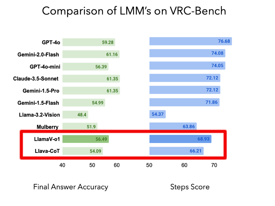 LlamaV-o1 surpasses competitors like Claude 3.5 Sonnet and Llava-CoT by achieving a reasoning step score of 68.93 and running 5x faster during inference. This release is accompanied by VRC-Bench, a benchmark that evaluates models based on reasoning steps rather than just final answers, marking a significant shift in assessing AI interpretability and logical flow.
