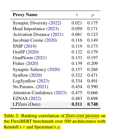 • GPT-2 benchmark: Outperforms other ZC proxies (τ = 0.87, ρ = 0.98)