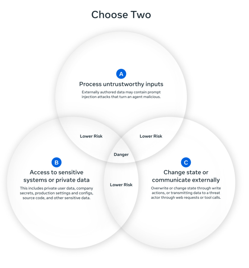 Meta’s new research says an agent should only have 2 of 3 powers at once, handling untrusted input, accessing private data, or changing state and talking to outside systems.