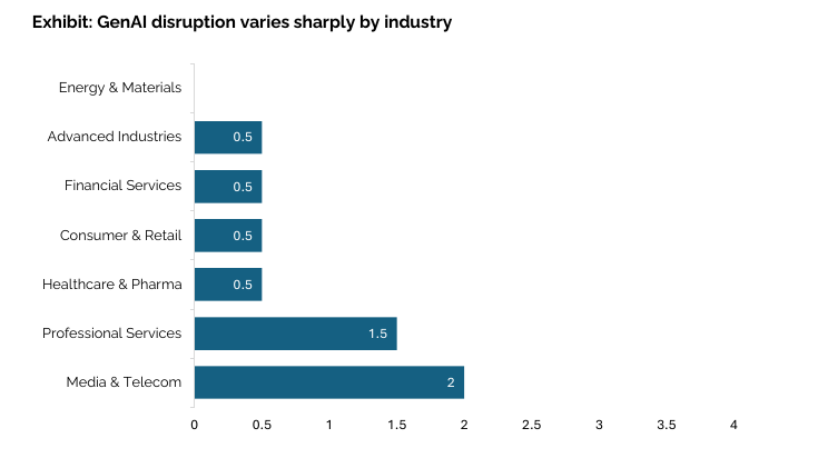 Only 2 industries, Technology and Media, show real structural change while 7 others remain mostly unaffected, which the report quantifies with a disruption index built from market share shifts, new AI-native models, and behavior changes.