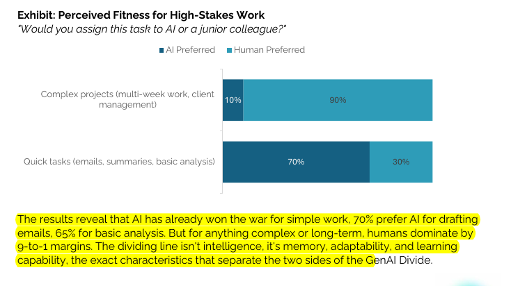 Workers prefer AI for quick drafting and simple analysis (70% and 65% respectively), but for complex, long-running, or high-stakes work humans win by roughly 9-to-1, which is another way of saying memory and adaptation are the bottleneck, not raw fluency.