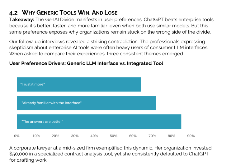 The big split they call the GenAI Divide is simple, 95% of organizations get nothing from GenAI pilots while a tiny 5% extract millions, and the driver is not the model itself but whether the system can learn, remember, and fit the workflow.
