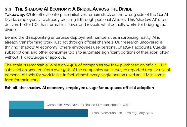 Even when companies do not buy official seats, employees still use personal LLMs at work, with regular use reported in 90%+ of surveyed companies versus ~40% that purchased enterprise subscriptions, so bottom-up value is already happening outside IT.