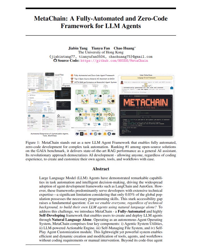 → MetaChain is presented as a fully automated, zero-code framework for LLM agents. It acts as an autonomous Agent Operating System.