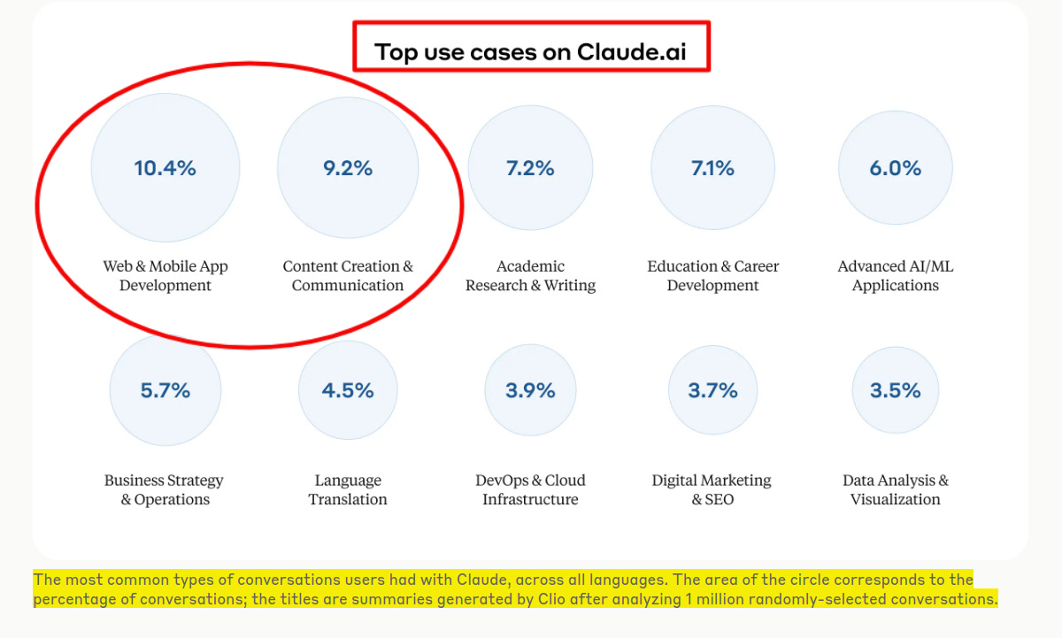 📡Anthropic’s new research shows Coding/App-development and Content creation is the top real-world use case of Claude model