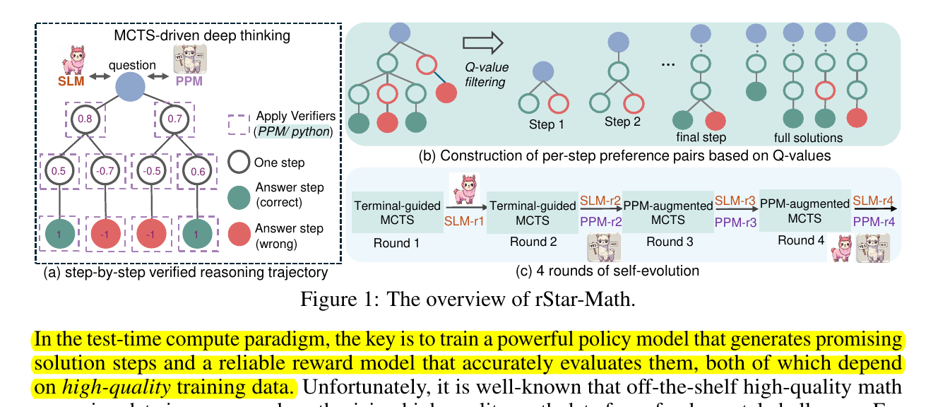 rStar-Math uses small language models (SLMs) (e.g., 1.5B, 3.8B, and 7B parameters) combined with a 7B Process Preference Model (PPM) can achieves performance comparable to much larger models like GPT-o1-mini and Qwen2.5-Math-72B-Instruct. And it surpasses OpenAI o1-preview in math reasoning by achieving 90% accuracy on the MATH benchmark and solving 53.3% of AIME 2024 problems. This approach uses MCTS-driven (Monte Carlo Tree Search) self-evolution and process reward modeling to generate verified reasoning data, showing that SLMs can self-improve without relying on massive distillation models.