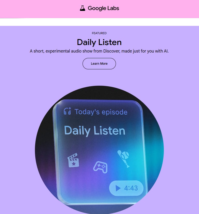 Google has launched an experimental feature called "Daily Listen" within Search Labs, which turns users' Search and Discover feed history into personalized, AI-generated 5-minute podcasts. This feature aims to provide a more interactive and faster way for users to consume news. It reflects Google's broader strategy of integrating AI-driven content delivery across its platforms.