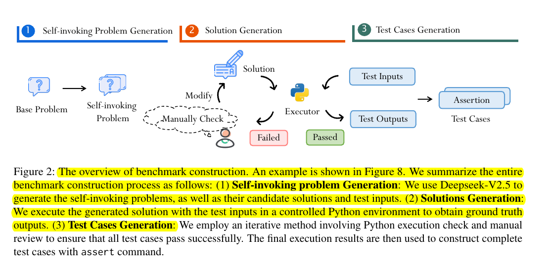 → Self-invoking benchmark construction used DeepSeek-V2.5 to create problems, followed by iterative manual verification to ensure correctness.