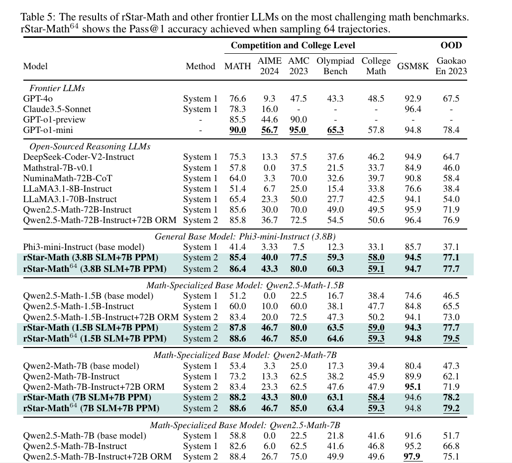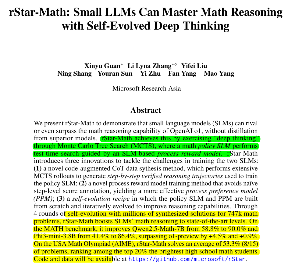Key benchmarks showed that rStar-Math boosts Qwen2.5-Math-7B from 58.8% to 90% on MATH and 41.4% to 86.4% on Phi3-mini-3.8B.