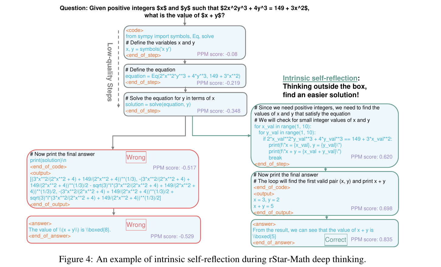The point being demonstrated: rStar-Math’s MCTS-based reasoning can revise its approach mid-solution based on step-level evaluation, showcasing an emerging capability of self-correction and adaptability.