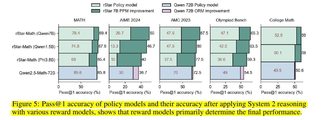 System 2 reasoning here means generating multiple solution paths using MCTS and then selecting the best one based on a reward model. The figure highlights that Process Preference Models (PPM) or advanced Outcome Reward Models (ORM) can dramatically boost final performance. Even if the underlying policy model’s baseline score is low, combining it with a strong reward model can push the overall accuracy closer to top-tier results.
