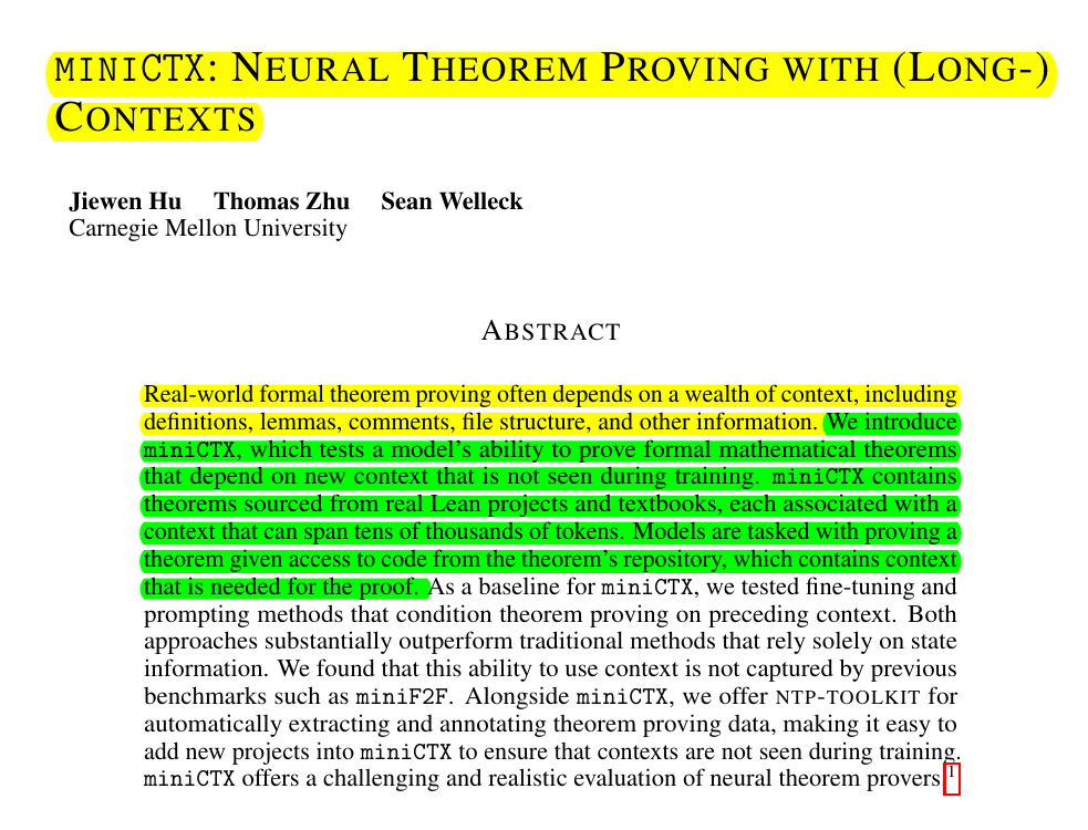 • Introduced miniCTX: A benchmark to evaluate neural theorem provers' ability to handle context-dependent theorem proving