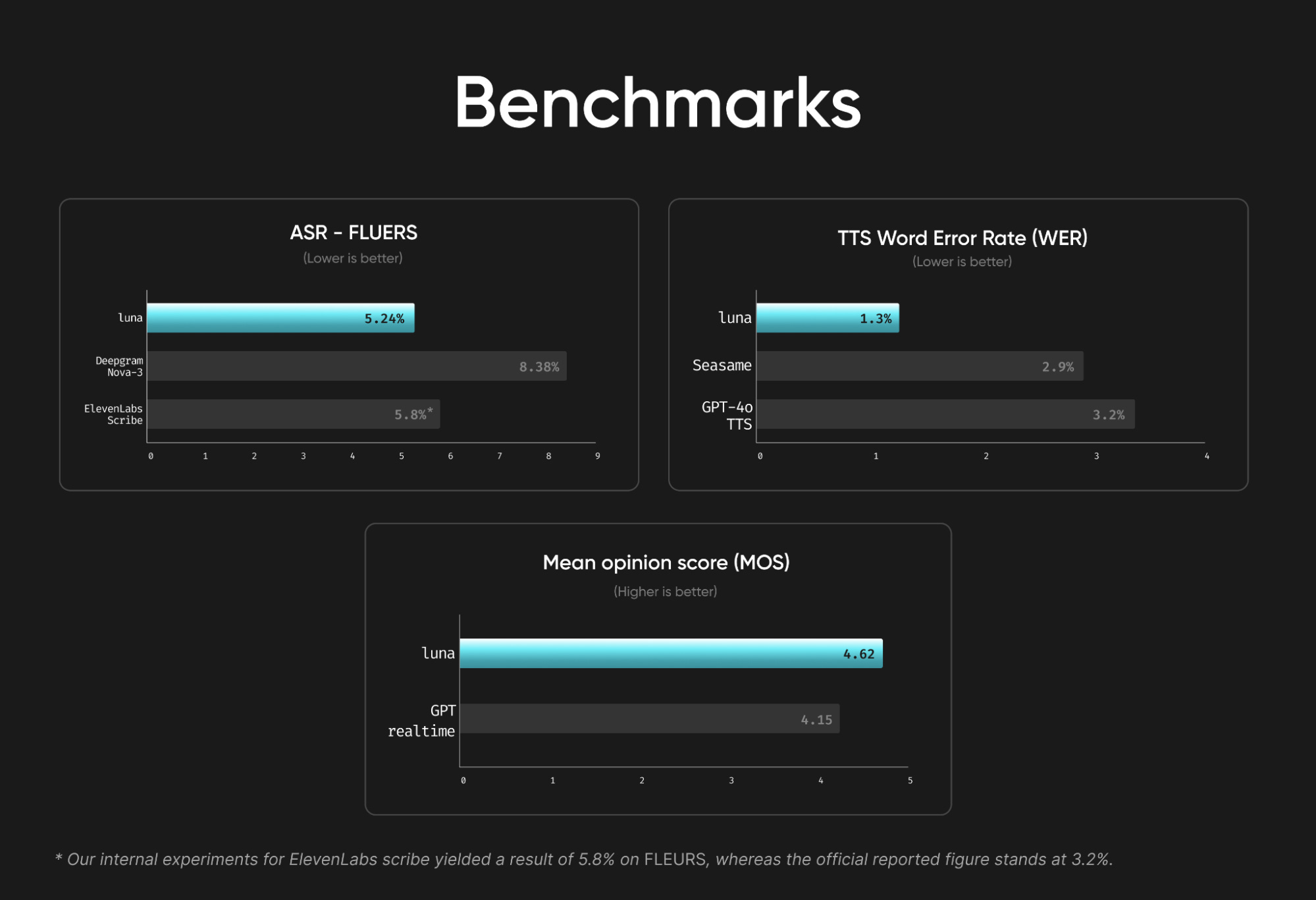 TTS WER: Luna got 1.3% (tops Sesame’s 2.9% & GPT-4o TTS’s 3.2%)