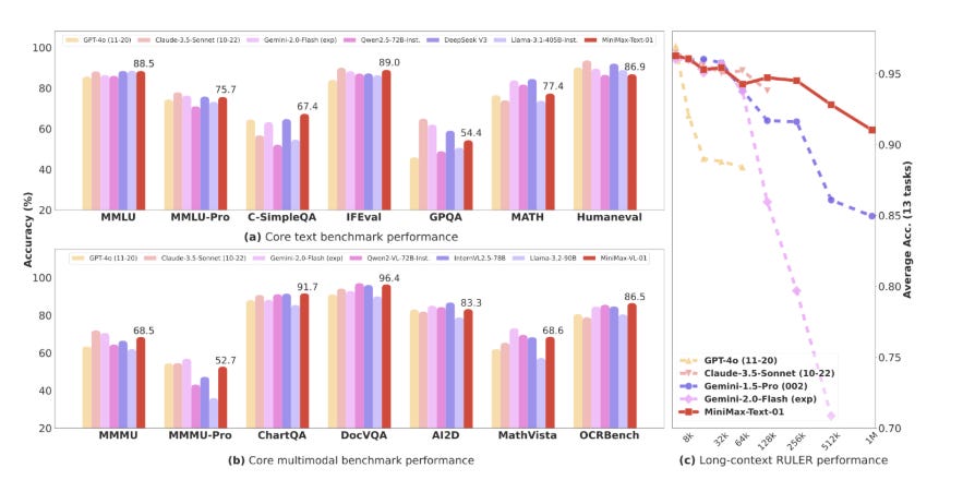 → MiniMax's long-context benchmarks, including Needle-In-A-Haystack retrieval, show 100% accuracy even with 4 million tokens. Performance remains on par with leading models in NLP and multi-modal tasks.