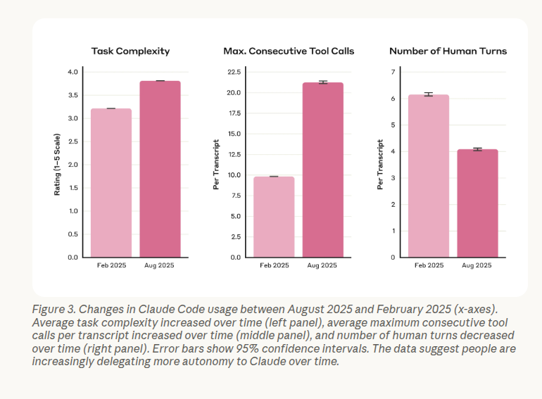 There is a clear trend toward autonomy, with the AI now handling about 20 consecutive actions—like editing files or running commands—on its own, which is double what it could do in February-25. This capability allows staff to act as “full-stack” developers, meaning a backend engineer can suddenly build a complex user interface by prompting the AI rather than learning the specific framework from scratch.