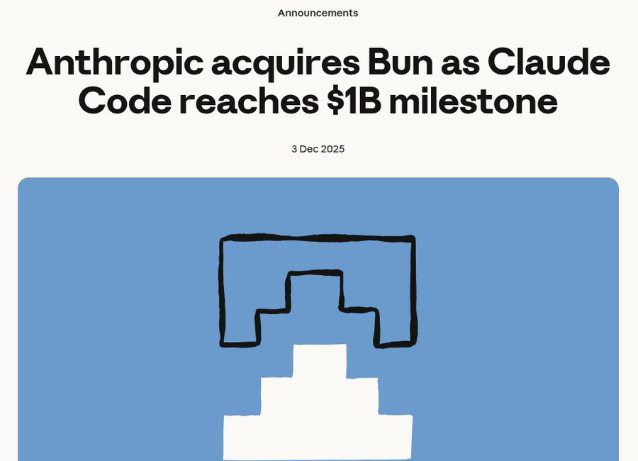 📡 Anthropic acquires Bun (JavaScript Runtime) to accelerate code, announces Claude Code hit $1B milestone.