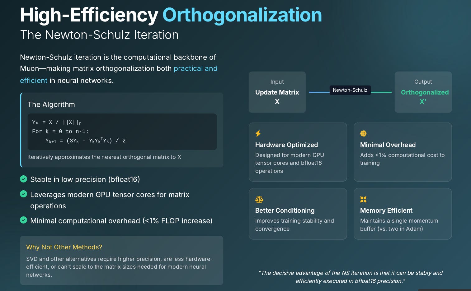 Muon avoids the high computational cost of exact singular value decomposition by using Newton–Schulz iteration to approximate an orthogonal update. This approach runs entirely on tensor cores in mixed precision and adds less than 1 % extra floating-point operations per training step, delivering fast and efficient hardware performance.