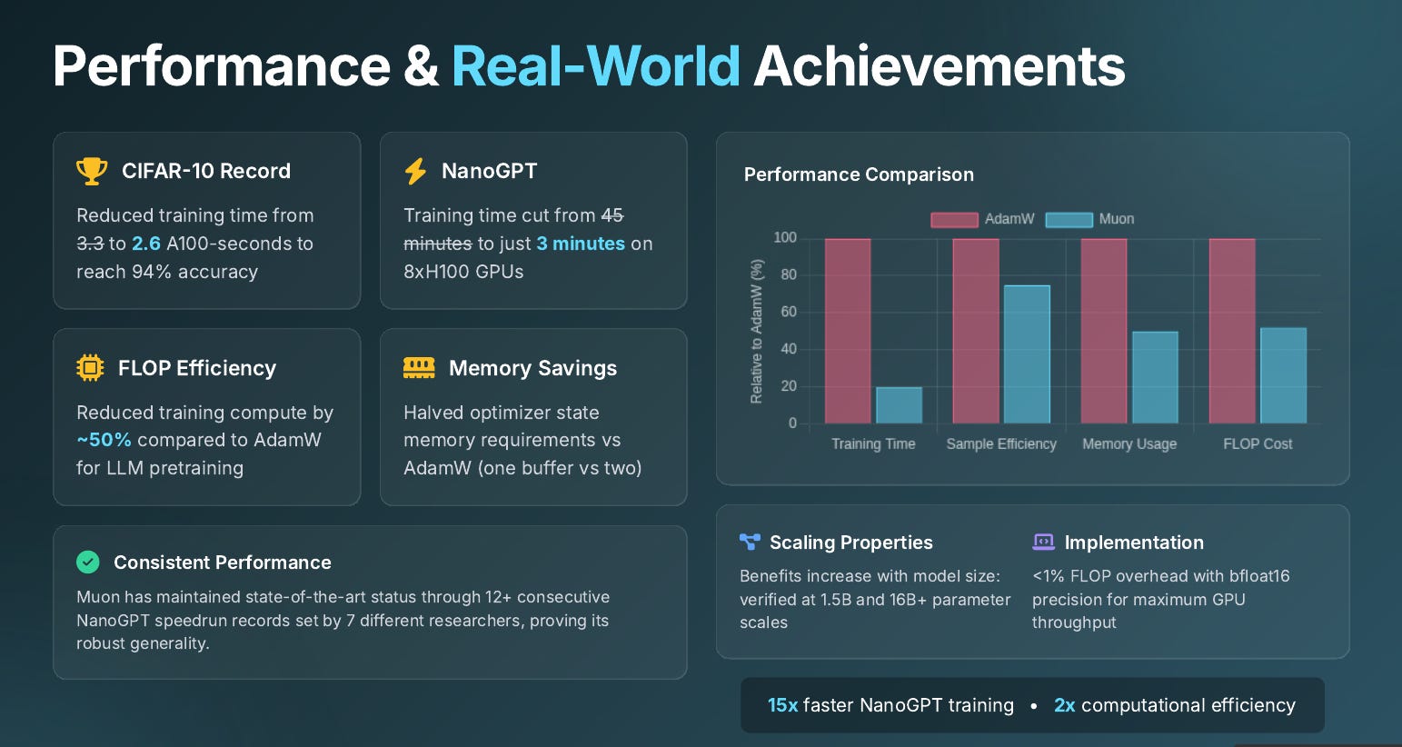 Kimi.ai trained a 16 B MoE on 5.7 T tokens with Muon and used only 52 % of AdamW flops after adding weight-decay and per-shape scaling. In their tech-report they said “Scaling law experiments indicate that Muon achieves ∼ 2× computational efficiency compared to AdamW with compute optimal training.”