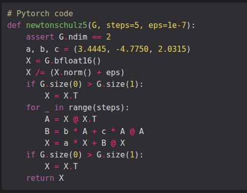 where ‘NewtonSchulz5’ is defined to be the following Newton-Schulz matrix iteration (Bernstein & Newhouse, 2024; Higham, 2008; Björck and Bowie, 1971; Kovarik, 1970):