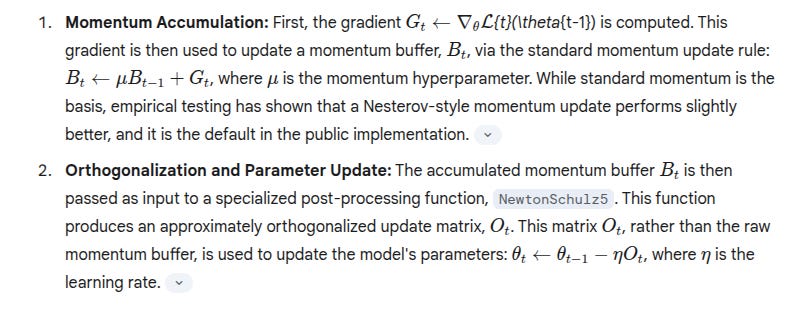 Instead of applying this averaged gradient directly, muon turns B_t into an almost orthogonal matrix O_t using five fast Newton-Schulz iterations.