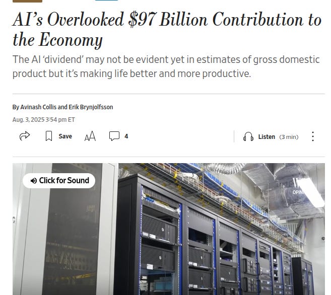 And this report says, Generative AI’s $97 billion in consumer surplus dwarfs the roughly $7 billion in U.S. revenue recorded by OpenAI, Microsoft, Anthropic and Google from their generative AI offerings last year.