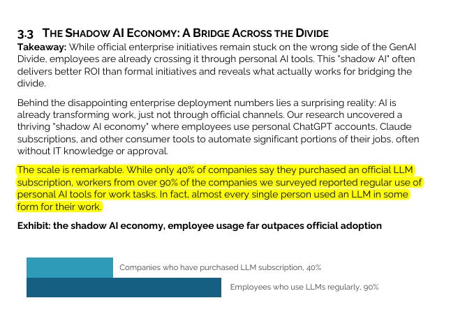 People then grab flexible consumer tools that feel responsive, finish the task, and move on, which boosts productivity but never gets recorded as “AI ROI” on a program tracker. This is the “shadow economy” logic, value is created off the books, so dashboards show failure while work output shows gains.