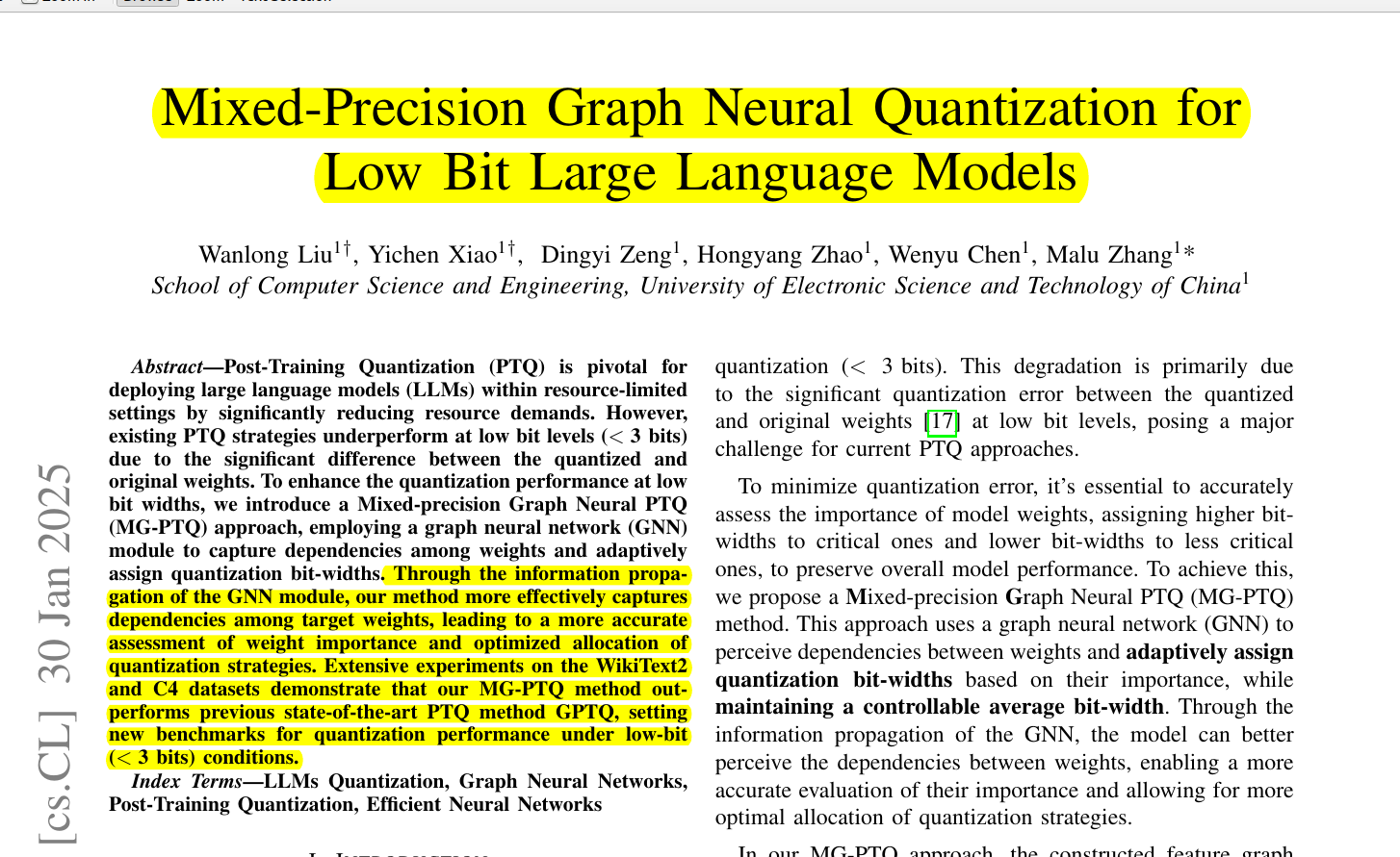 → This paper proposes a Mixed-precision Graph Neural Post-Training Quantization method called MG-PTQ.