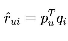 Here p_u is the learned embedding vector representing user u's latent preferences, and q_i is the learned embedding vector representing item i's latent attributes. The dot product p_u^T q_i estimates user u's affinity for item i.