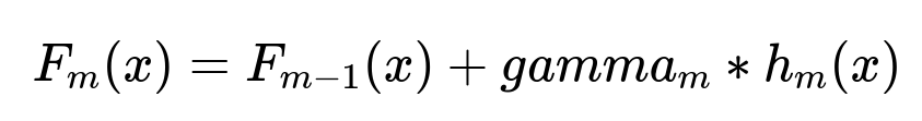 Here, m represents the iteration index, gamma_{m} is the learning rate or step size for iteration m, and h_{m}(x) is the newly fitted weak learner (decision tree). The final prediction is the sum of all incremental updates added over each iteration.