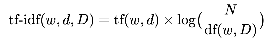 Here, w is a word in listing d, N is total number of listings in corpus D, tf(w,d) is word wâs count in d, and df(w, D) is the number of listings that contain w.
