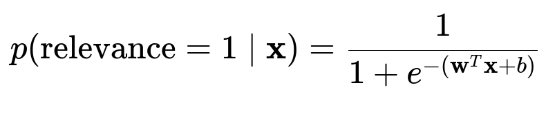p(relevance=1 | x) is the probability that the candidate item/store is relevant given feature vector x.