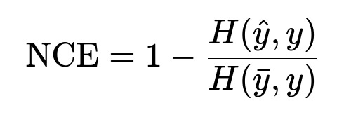 Here H(\hat{y}, y) is the cross-entropy between predicted labels and true labels. H(\bar{y}, y) is the cross-entropy of a naive model (for example, a baseline that always predicts a constant probability). \hat{y} is the predicted probability, y is the actual label, and \bar{y} is the baseline probability. NCE close to 1 indicates the model is better than the baseline. NCE close to 0 indicates no improvement.