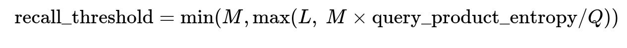 Their new approach introduces a way to measure the specificity of each query so they can adaptively choose how many items to retrieve from text-based retrieval and how many from embedding-based retrieval. They propose using a “query entropy” model to capture the likelihood distribution of relevant documents for each query. For example, highly specific queries have fewer relevant items, while generic queries have many. They use this metric to adapt their recall thresholds for text and embedding retrieval, so each query’s retrieval set size is determined by the query’s entropy score.