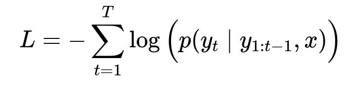 p(y_{t}|y_{1:t-1}, x) is the predicted probability of the next token given previous tokens and the context. Minimizing this loss helps the model produce more accurate next-token predictions.