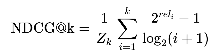 Here Z_k is a normalizing constant so that the ideal ranking has NDCG@k = 1.0. rel_i is the relevance score for the business at rank i. The rank index is i. The term 2^{rel_i} - 1 ensures higher relevance gains more weight, while log_2(i+1) discounts items at lower ranks.