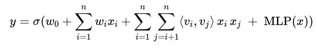 Here y is the predicted probability, x_i is the i-th feature value, w_i is the linear weight, v_i is the embedding vector for feature i, sigma is the sigmoid function, and MLP(x) is a multi-layer perceptron on the same input x. The double sum captures pairwise feature interactions through dot products of embedding vectors.