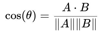 Where A and B are embeddings in a high-dimensional space. A dot B denotes their dot product. The norm of A is the square root of the sum of squares of A’s coordinates, same for B. The closer the result is to 1, the more similar the videos.