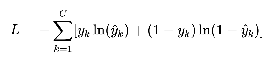 Here, C is the number of possible intent classes, y_{k} is 1 or 0 indicating if the sample belongs to class k, and hat{y}_{k} is the modelâs predicted probability for class k. This formula is the binary cross-entropy applied across each class output.