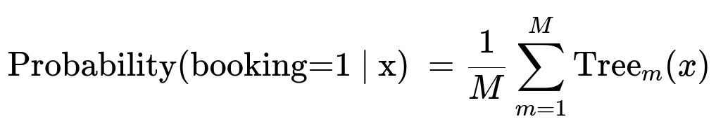 Above, M is the total number of decision trees. Each Tree_{m}(x) outputs a probability for booking. They average these probabilities to get the final score.